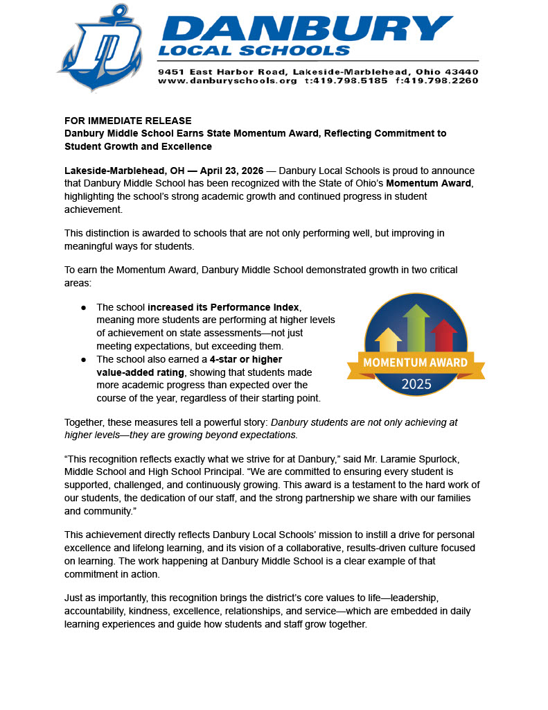 Danbury Local School District is excited to announce our 2025-26 honorees for the Danbury Core Value of “Kindness”. This year's honorees are Penny Orshoski (2nd Grade), Ayleigh Richards (6th Grade)...