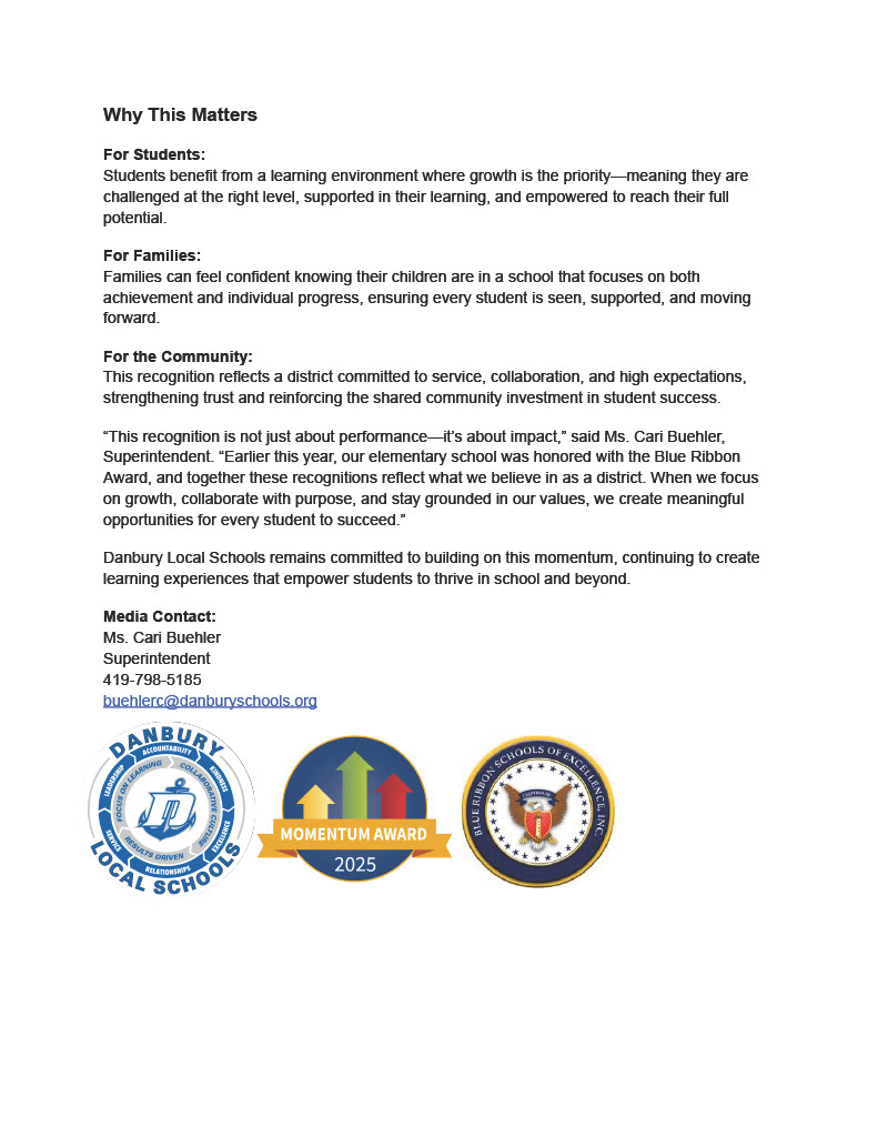 PRESS RELEASE: Danbury Middle School Earns State Momentum Award, Reflecting Commitment to Student Growth and Excellence